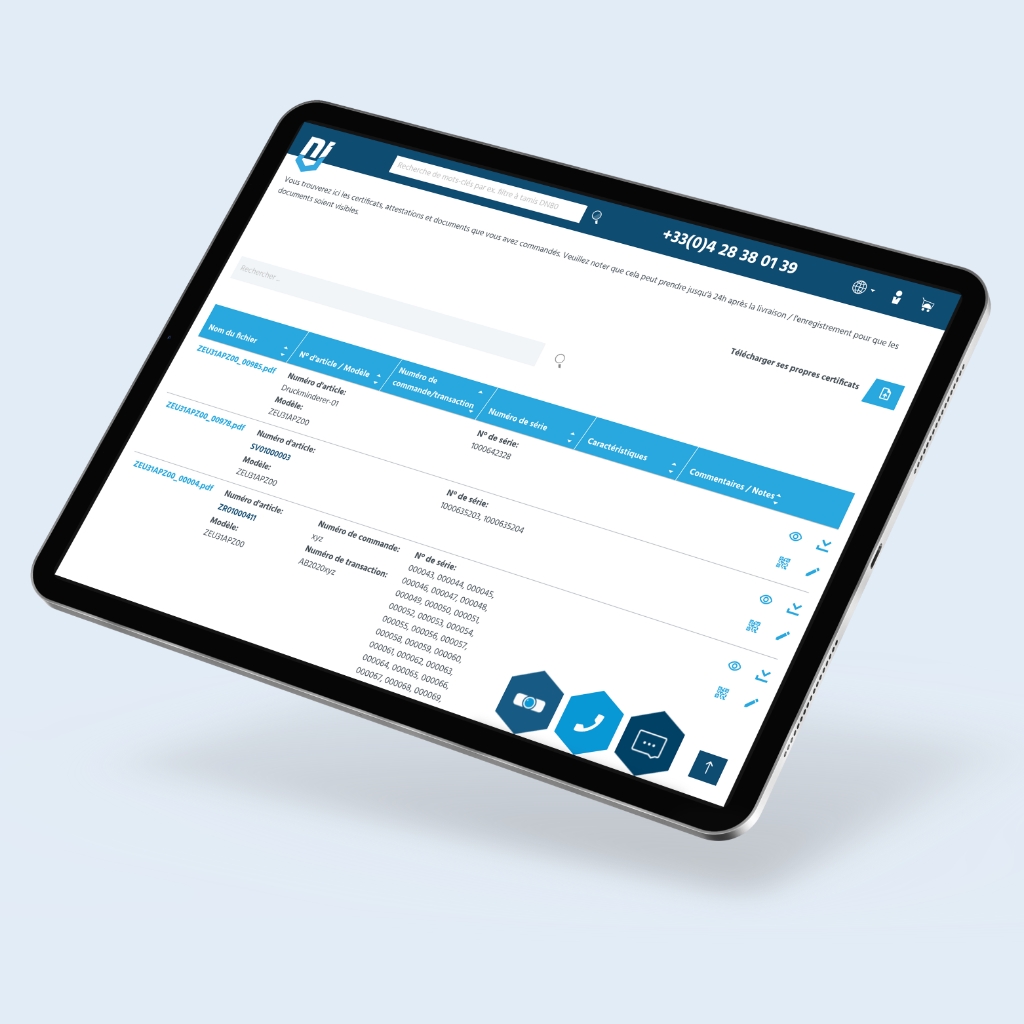 NieRuf facilite l'accès aux certificats que vous avez commandés grâce à une plateforme conviviale et un système de gestion de téléchargement intuitif. À l'aide du numéro de commande ou du numéro de série, vous pouvez télécharger vos documents rapidement et facilement. De plus, vous pouvez télécharger et gérer vos propres documents, qu'ils aient été créés par d'autres fournisseurs ou par vous-même.